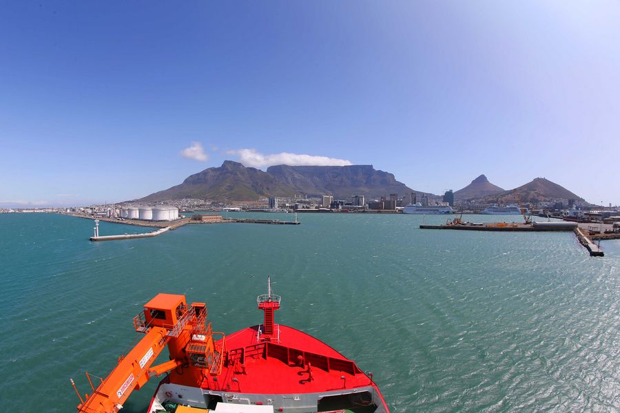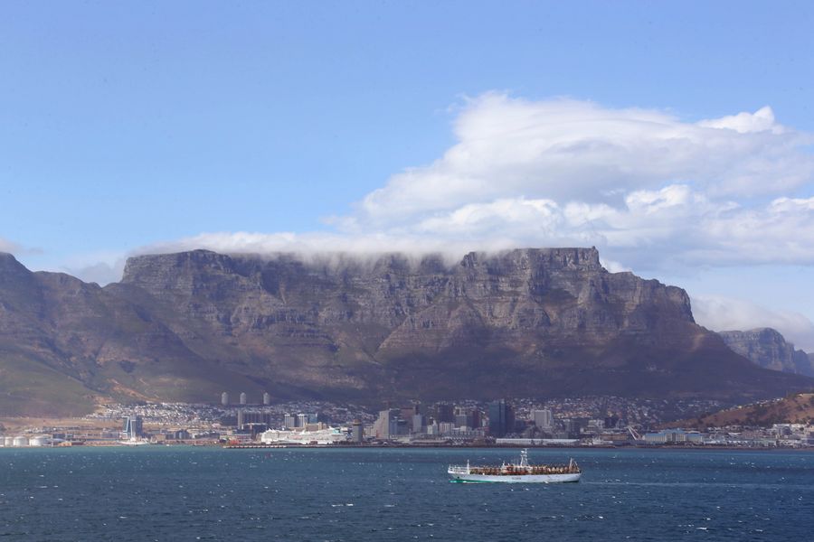 Table Mountain is seen from China's polar icebreaker Xuelong 2, or Snow Dragon 2, as it heads for Cape Town of South Africa on Jan. 20, 2020. (Xinhua/Liu Shiping)