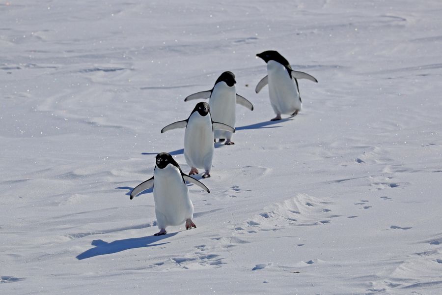 Penguins are seen on floating ice in the Cosmonauts Sea on Dec. 20, 2019. (Xinhua/Liu Shiping)■