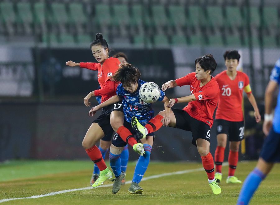 Choe Yuri(L) and Park Yeeun (R) of South Korea vies with Endo Jun of Japan during the women's match between Japan and South Korea at the 2019 East Asian Cup in Busan, South Korea, Dec. 17, 2019. (Xinhua/Zhang Keren)
