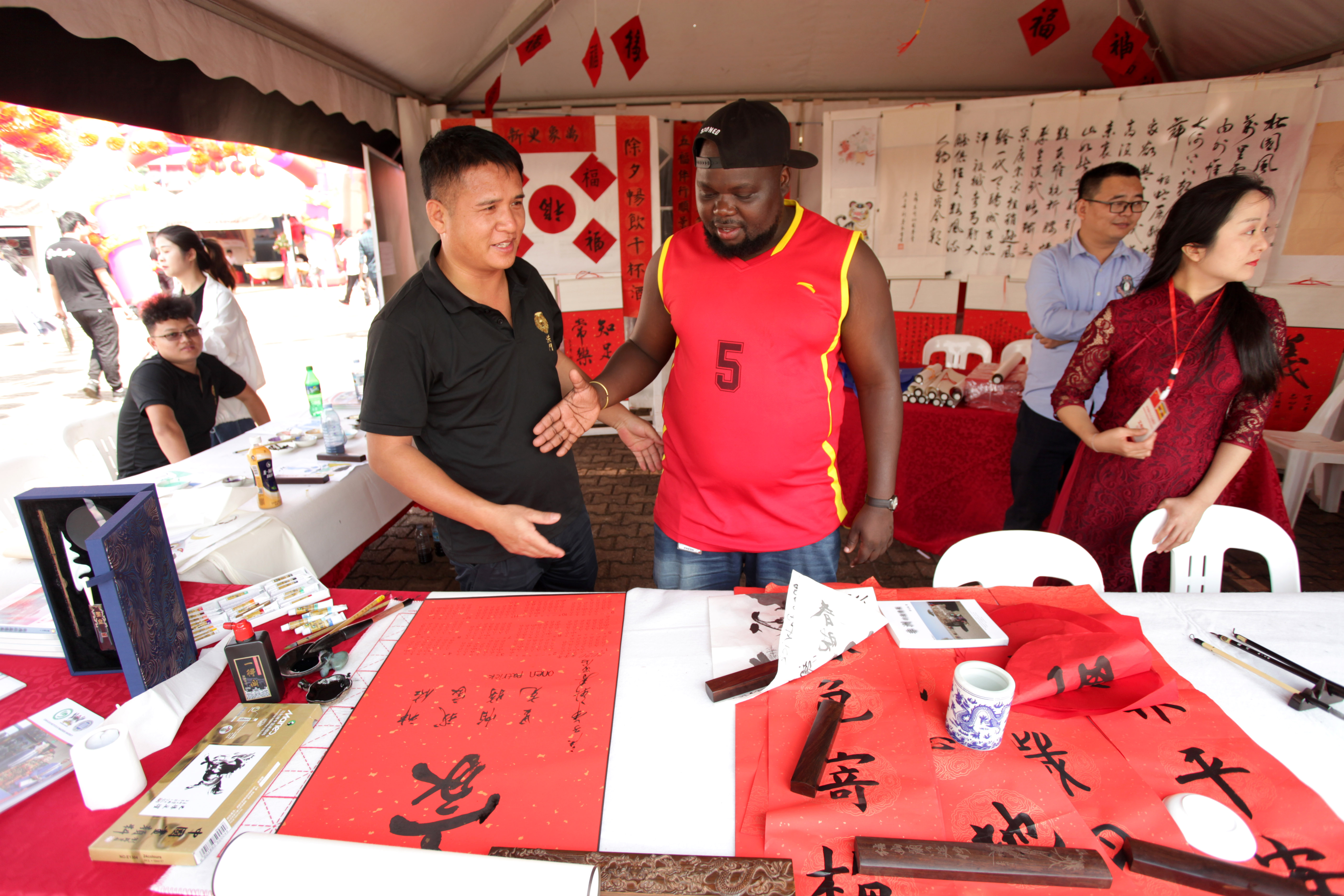 A Ugandan interacts with a Chinese calligraphy artist during a Chinese folk custom fair in Kampala, Uganda, Jan. 12, 2020. (Photo by Hajarah Nalwadda/Xinhua)