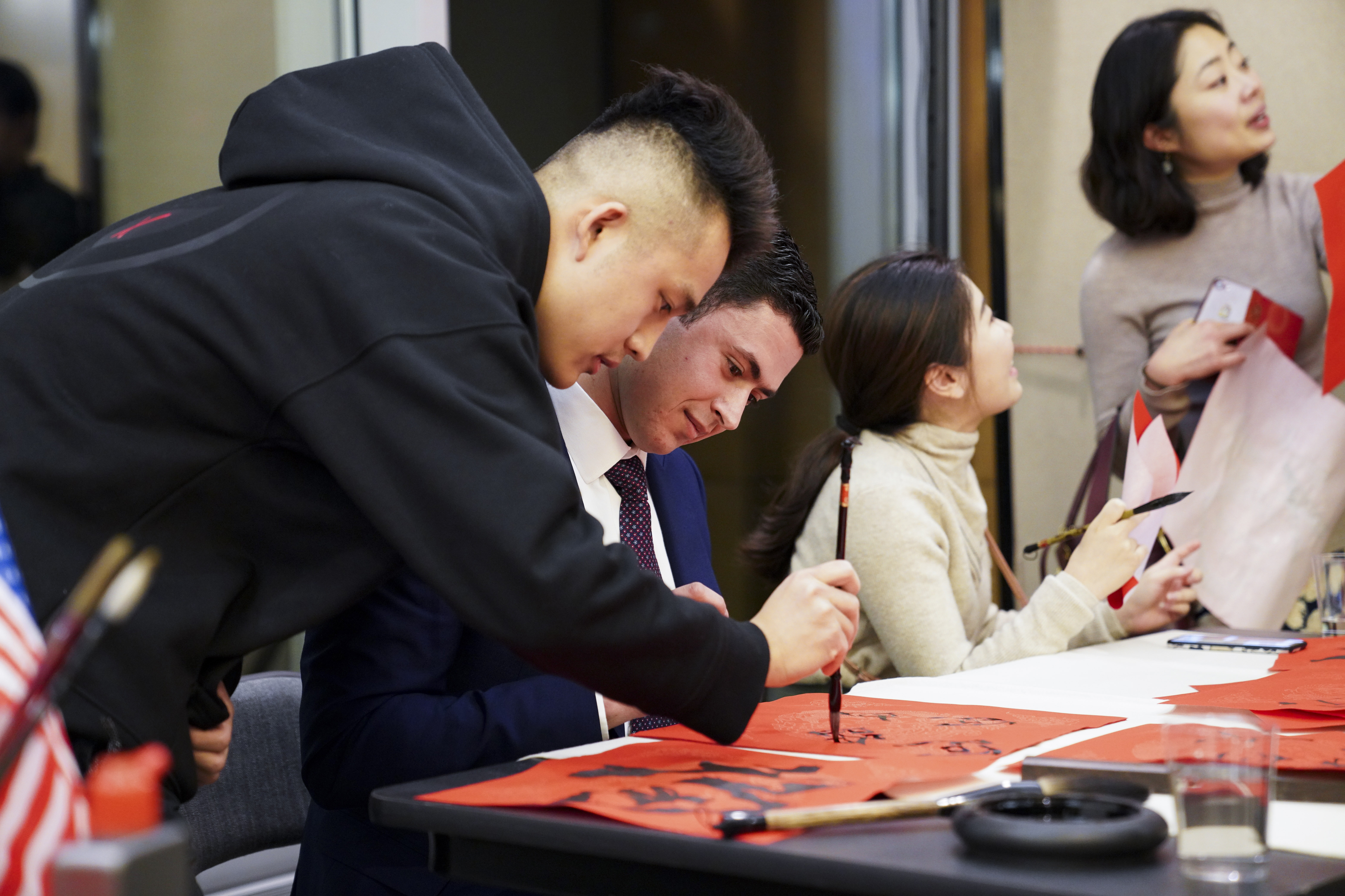 People practise calligraphy at the New Year celebration in Dallas, Texas, the United States, Jan. 12, 2020. (Photo by Dan Tian/Xinhua)