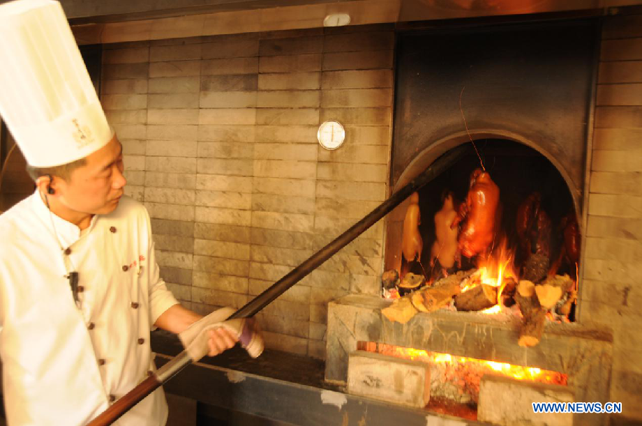 Roast duck is prepared in wood fired kilns at the 4 Seasons Restaurant near Beijing’s popular Qianmen street, on Jan. 21, 2020. Whilst an extremely rich meat, the dish is popular with locals and tourists alike, with the fiery ovens thought to give the duck extra flavour. Beijing duck is usually enjoyed in thin pancakes rolled around spring onions and cucumber, and hoisin sauce. (Xinhuanet/ Andrew Birse)