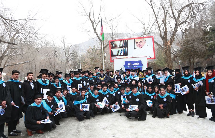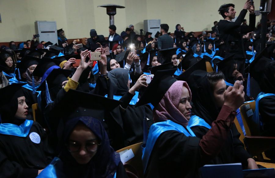 Afghan students pose for photos during their graduation ceremony at Kabul University in Kabul, Afghanistan, Jan. 20, 2020. (Xinhua/Rahmatullah Alizadah)