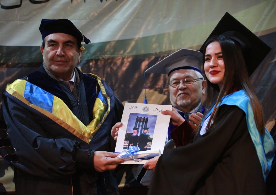 An Afghan student receives her certificate during a graduation ceremony at Kabul University in Kabul, Afghanistan, Jan. 20, 2020. (Xinhua/Rahmatullah Alizadah)