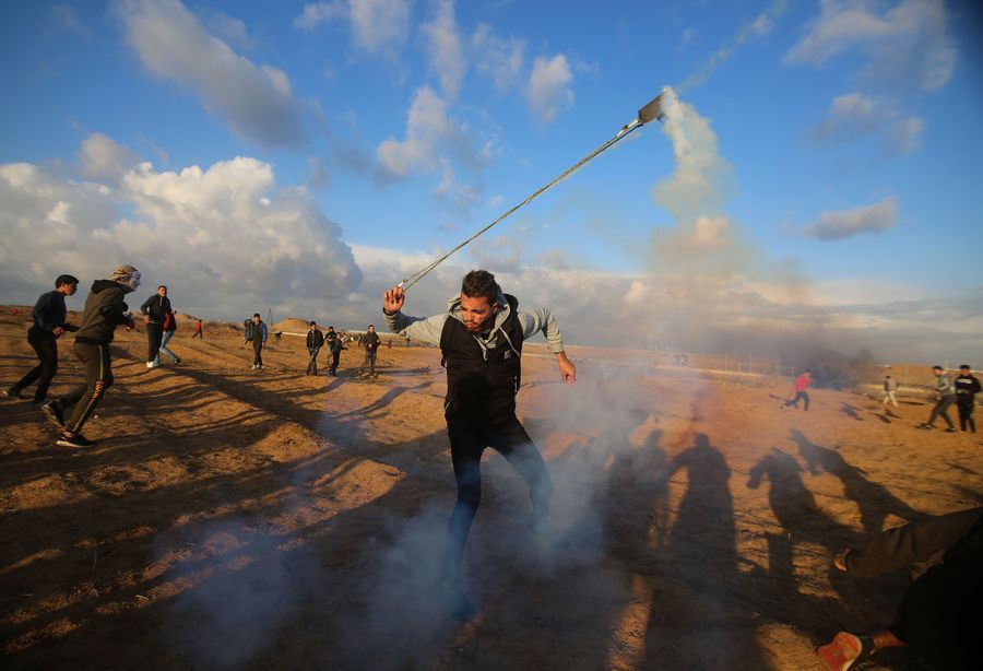 A Palestinian protester uses a slingshot to throw back a tear gas canister fired by Israeli troops during clashes on the Gaza-Israel border, east of southern Gaza Strip city of Khan Younis, on Dec. 27, 2019. (Xinhua/Khaled Omar)