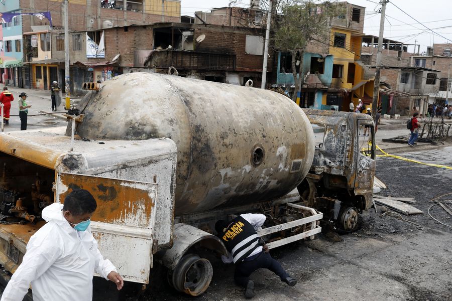 Police inspect a gas tanker after an explosion in the Villa el Salvador district in southern Lima, Peru, January 23, 2020.(Xinhua/Mariana Bazo)