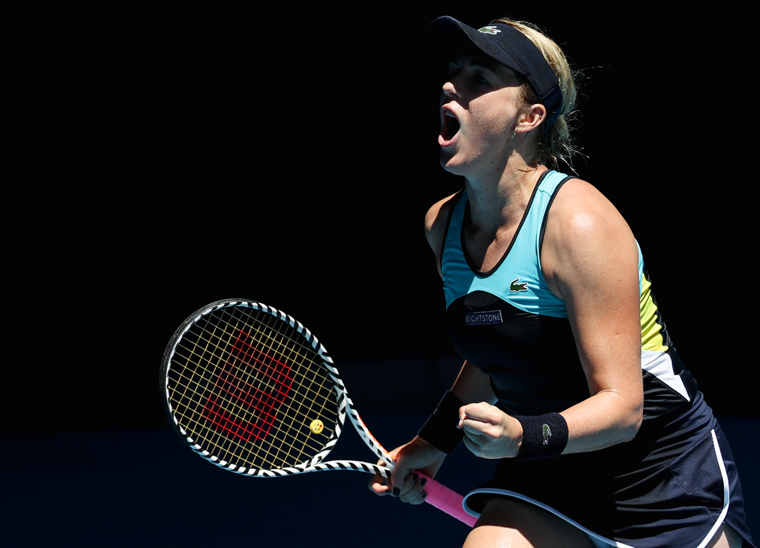 Anastasia Pavlyuchenkova of Russia celebrates during the women's singles third round match against Karolina Pliskova of the Czech Republic at the 2020 Australian Open tennis tournament in Melbourne, Australia, Jan. 25, 2020. (Xinhua/Zhu Hongye)