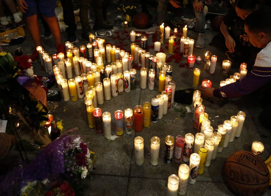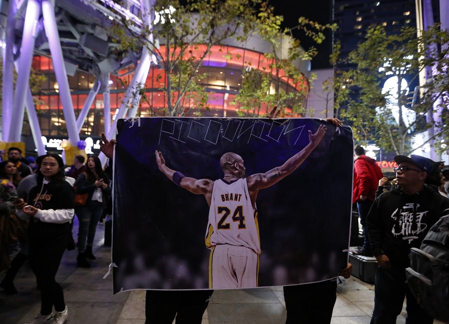 Mourners gather near the Staples Center to pay respects to Kobe Bryant, in Los Angeles, California, the United States, on Jan. 26, 2020. (Xinhua/Li Ying)