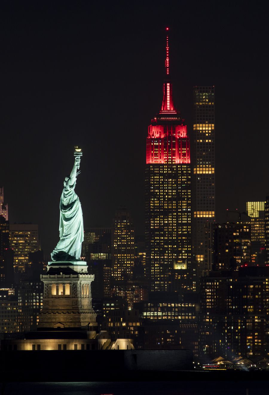 The top of the landmark Empire State Building is lit in red for the Chinese Lunar New Year in New York, the United States, Jan. 23, 2020. (Xinhua/Wang Ying)
