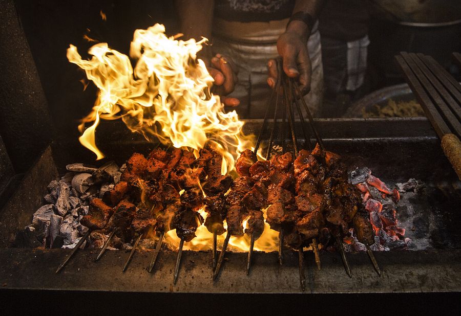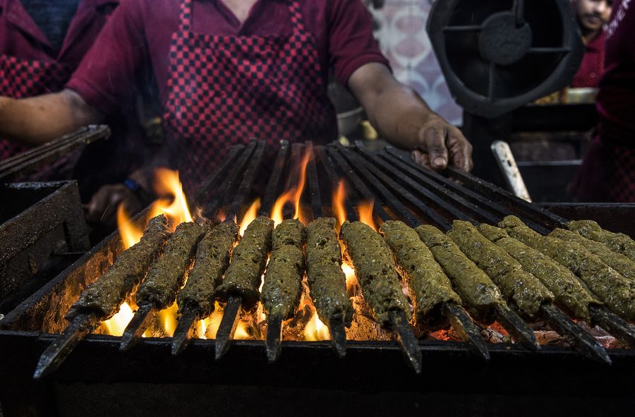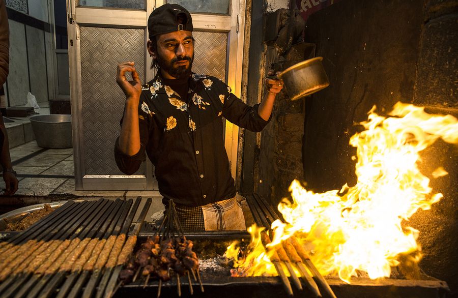 A street vendor roast barbeque at his roadside shop in Jamia Masjid area of Old Delhi, India, Jan. 27, 2020. (Xinhua/Javed Dar)