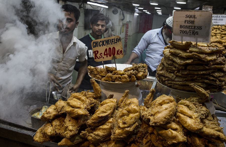 A street vendor fries chicken at his roadside shop in Jamia Masjid area of Old Delhi, India, Jan. 27, 2020. (Xinhua/Javed Dar)