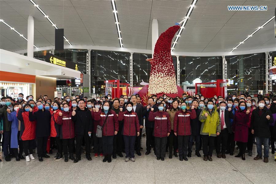 Medical team members pose for a photo at Chongqing Jiangbei International Airport in southwest China's Chongqing, Jan. 26, 2020. A team comprised of more than 130 medical workers from Chongqing left for Xiaogan City of Hubei Province on Sunday to aid the novel coronavirus control efforts there. (Xinhua/Liu Chan)