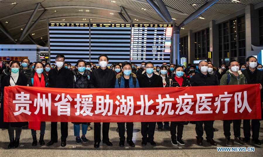Members of a medical team pose for a group photo before their departure to Wuhan of Hubei Province, in Guiyang, southwest China's Guizhou Province, Jan. 27, 2020. A team comprised of 137 medical workers from Guizhou left for Wuhan on Monday to aid the novel coronavirus control efforts there. (Xinhua/Tao Liang)