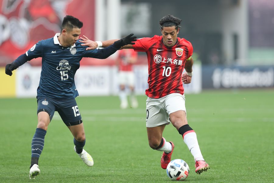 Shanghai SIPG FC's Hulk (R) competes during the AFC Champions League Qualifying football match between China's Shanghai SIPG FC and Thailand's Buriram United in Shanghai, east China, Jan. 28, 2020. (Xinhua/Ding Ting)