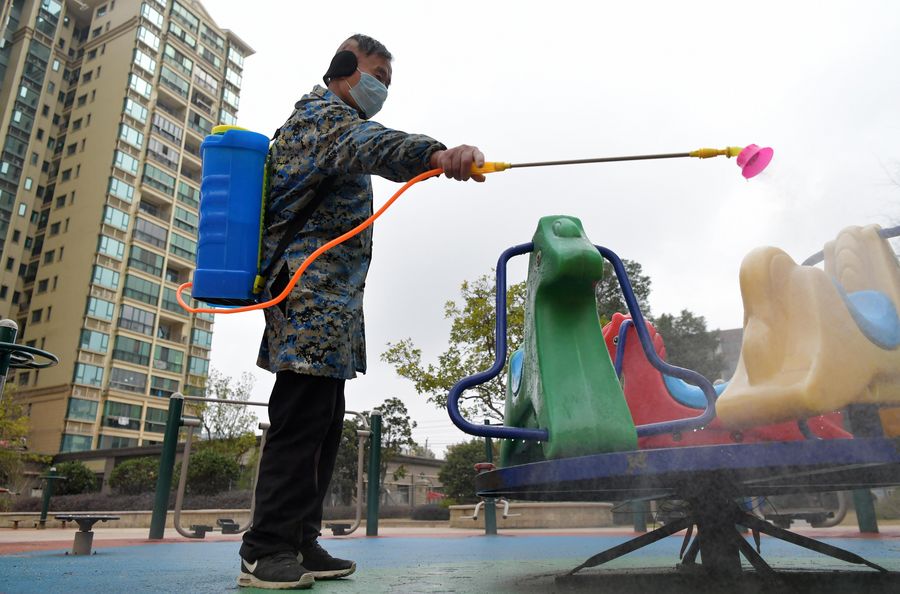 A staff member disinfects pubilc facilities at a community in Nanchang County of Nanchang City, east China's Jiangxi Province, Jan. 28, 2020. (Xinhua/Peng Zhaozhi)