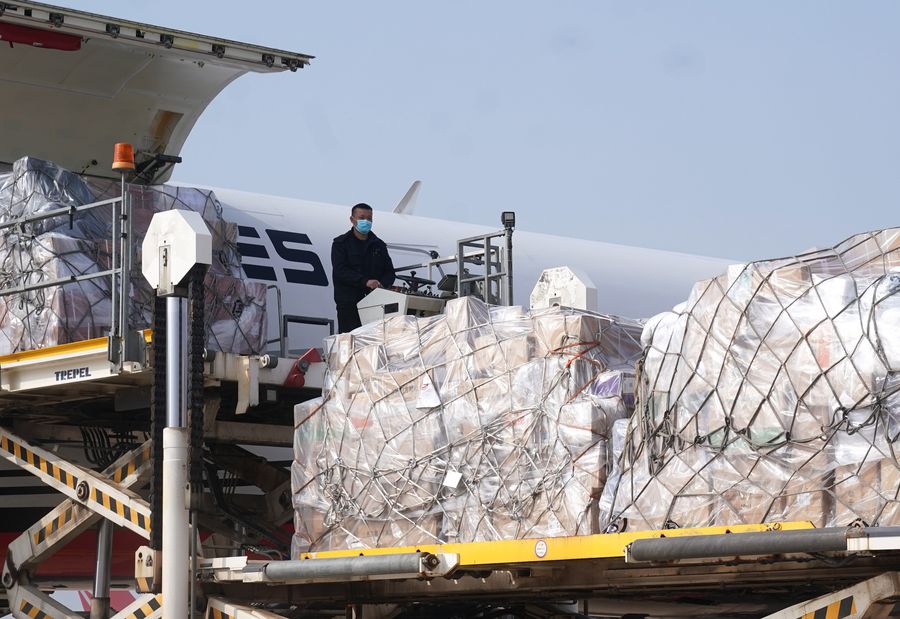 A worker unloads medical materials from a plane at the Wuhan Tianhe International Airport in Wuhan, central China's Hubei Province, Jan. 28, 2020. (Xinhua/Cheng Min)