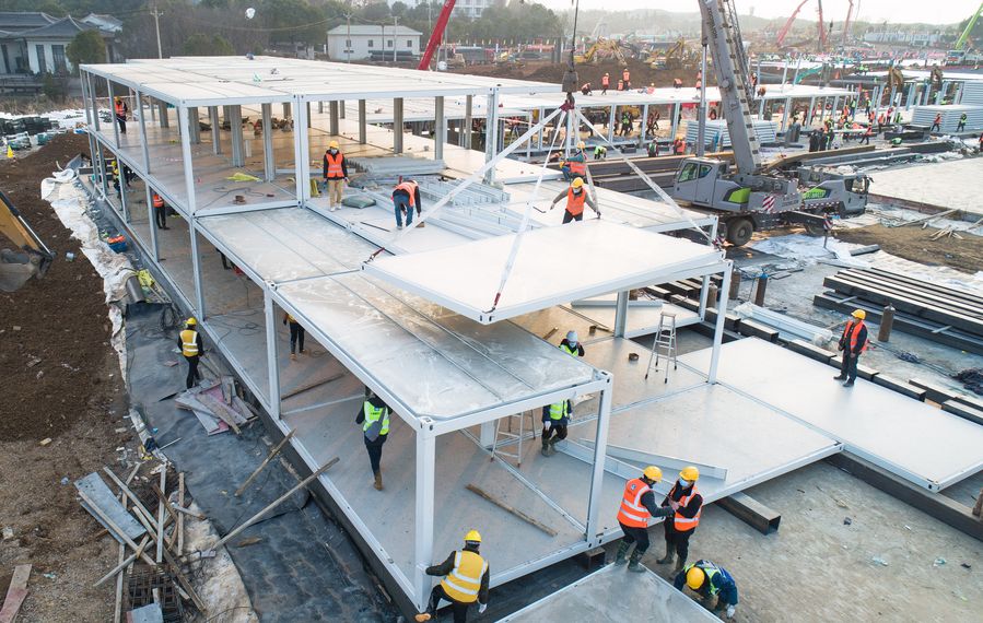 Photo taken on Jan. 28, 2020 shows laborers working at the construction site of Huoshenshan Hospital in Wuhan, central China's Hubei Province. (Xinhua/Xiao Yijiu)