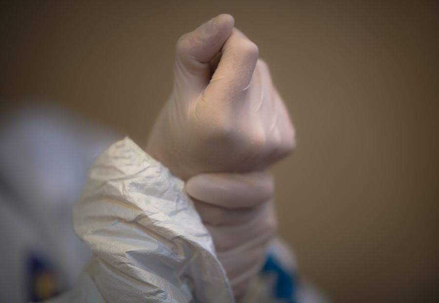A member of the medical team of the Second Military Medical University puts on protective gloves at Hankou Hospital in Wuhan, central China's Hubei Province, Jan. 27, 2020. (Xinhua/Xiao Yijiu)