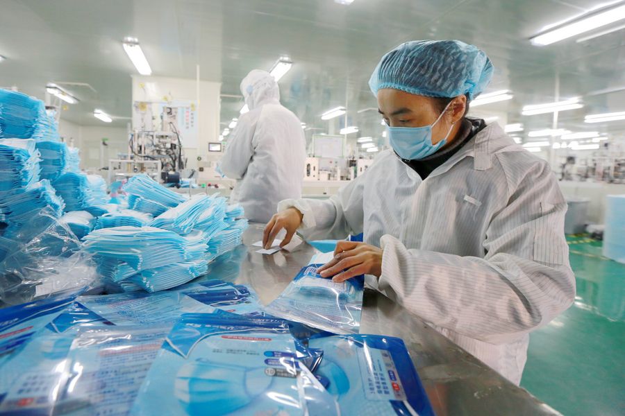 A worker packs protective masks at the workshop of a company in Xiajiang County, east China's Jiangxi Province, Jan. 29, 2020. To help fight the outbreak of pneumonia caused by novel coronavirus, workers of many medical material companies rushed back to work to make protective masks. (Photo by Chen Fuping/Xinhua)