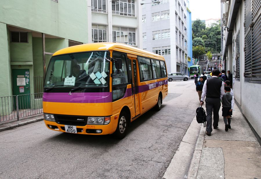 A school bus runs on a street at Wan Chai, south China's Hong Kong, Nov. 20, 2019. (Xinhua/Li Zhen)