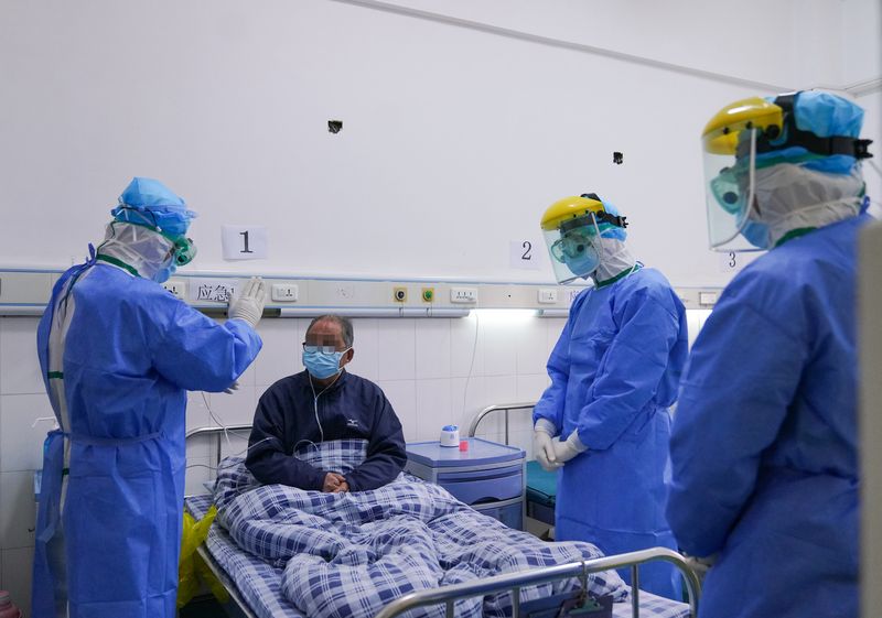 Doctors encourage a patient during making ward rounds in Zhangzhou Municipal Hospital in Zhangzhou, southeast China's Fujian Province, Feb. 2, 2020. (Photo by Xiao Heyong/Xinhua)