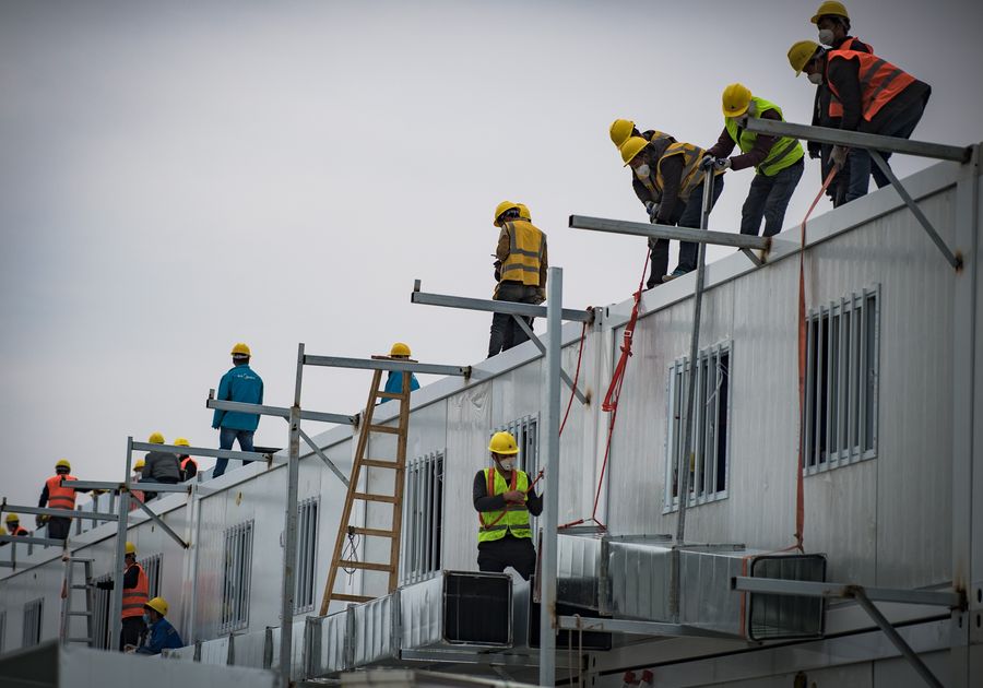 Workers work at the construction site of Huoshenshan (Fire God Mountain) Hospital in Wuhan, central China's Hubei Province, Feb. 1, 2020. (Xinhua/Xiao Yijiu)