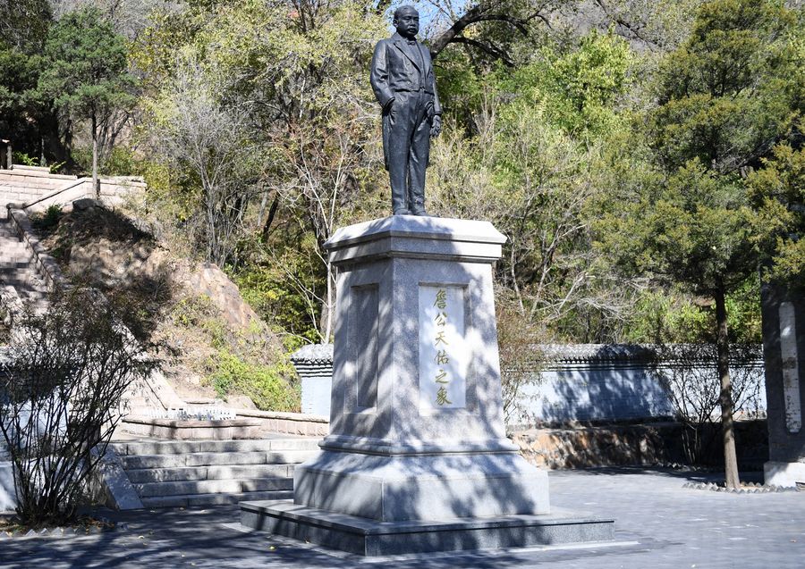 Photo taken on Oct. 18, 2018 shows the bronze statue of Zhan Tianyou at Qinglongqiao Station of the Beijing-Zhangjiakou railway in Yanqing District, Beijing, capital of China. (Xinhua/Zhang Chenlin)