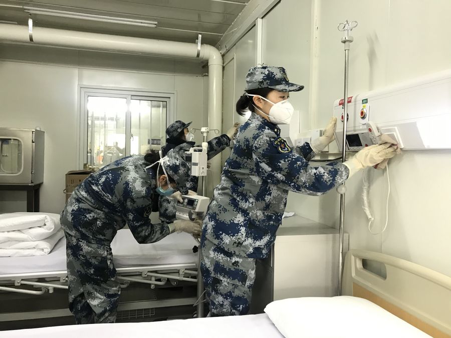 Medical staff test facilities and make the bed at Huoshenshan (Fire God Mountain) Hospital to make final preparations to admit patients infected with the novel coronavirus in Wuhan, central China's Hubei Province, Feb. 3, 2020. (Xinhua)