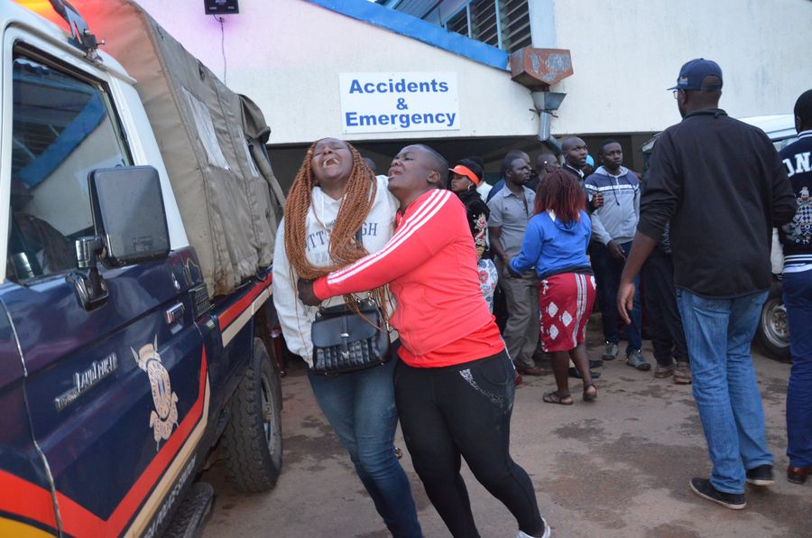 Some parents of pupils who died in a stampede at Kakamega Primary School on Monday evening mourn at the Kakamega County Teaching and Referral Hospital in Nairobi, Kenya, on Feb. 4, 2020. (Xinhua/Fred Mutune)