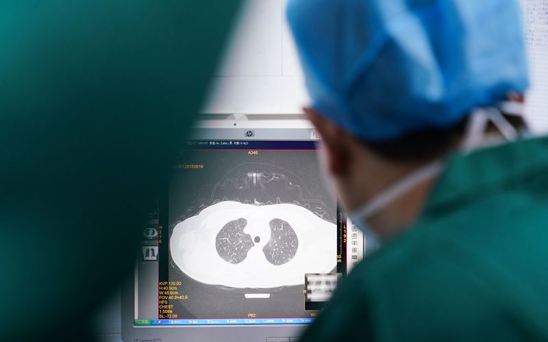 A doctor checks the CT image of a patient's lungs in Zhangzhou Municipal Hospital in Zhangzhou, southeast China's Fujian Province, Feb. 2, 2020. (Photo by Xiao Heyong/Xinhua)