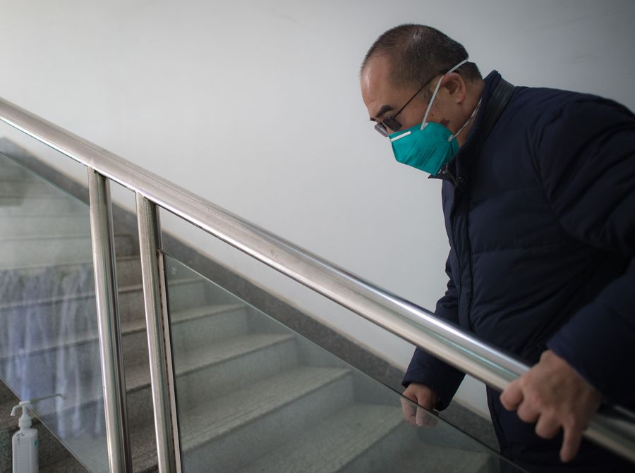 Because of ALS, Zhang Dingyu has to clutch at the handrail as he slowly makes his way up and down the stairs at Wuhan Jinyintan Hospital in Wuhan, central China's Hubei Province, Jan. 29, 2020. (Xinhua/Xiao Yijiu)