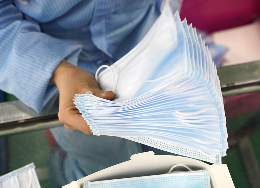 A worker makes protective masks at a medical material manufacturer in Wuhan, central China's Hubei Province, Jan. 28, 2020. (Xinhua/Cai Yang)