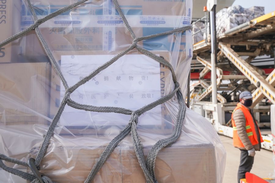 A worker unloads medical and epidemic prevention supplies at Wuhan Tianhe International Airport in Wuhan, central China's Hubei Province, Jan. 28, 2020. (Xinhua/Cheng Min)