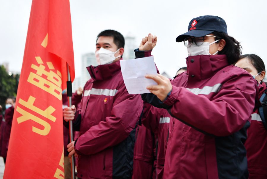 Before leaving for Hubei Province, medical team members take an oath in Fuzhou, southeast China's Fujian Province, Feb. 4, 2020. A medical team comprised of 100 clinical nurses in Fujian left for Wuhan on Tuesday to aid the novel coronavirus control efforts there. (Xinhua/Wei Peiquan)