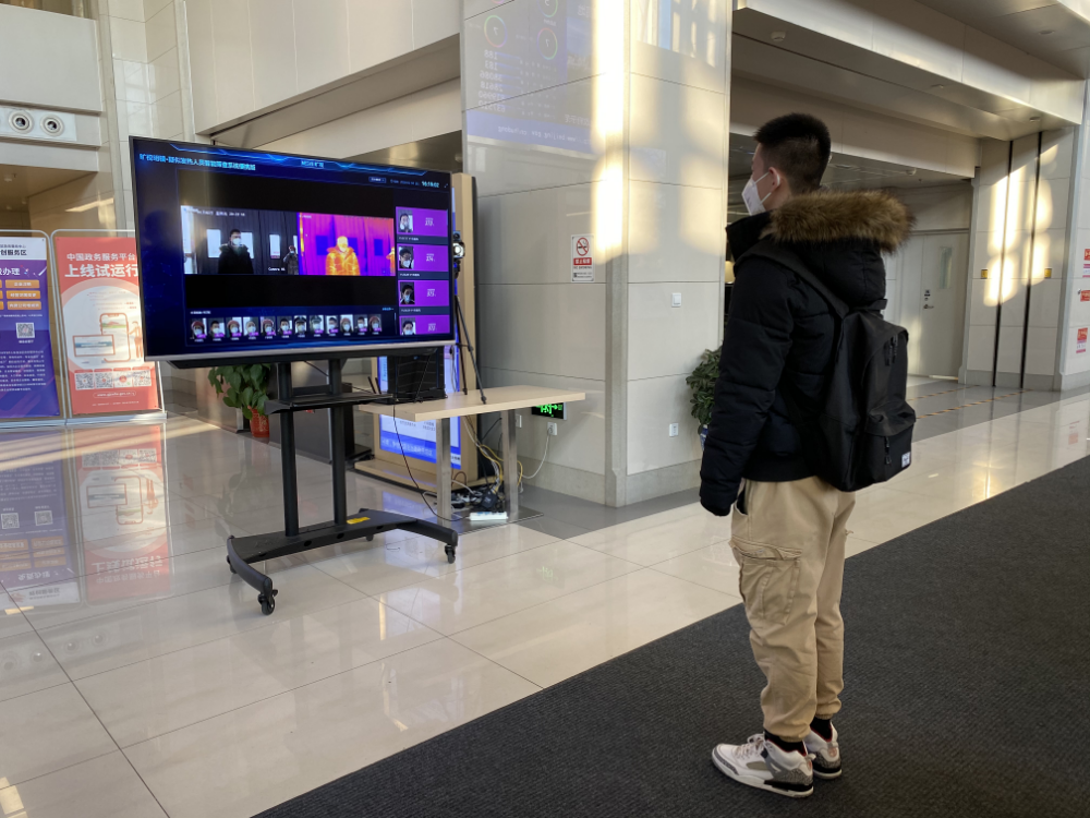 The AI fever screening system scans a visitor in Haidian District Service Hall, Beijing, Feb. 4, 2020. (Photo provided to Xinhua)