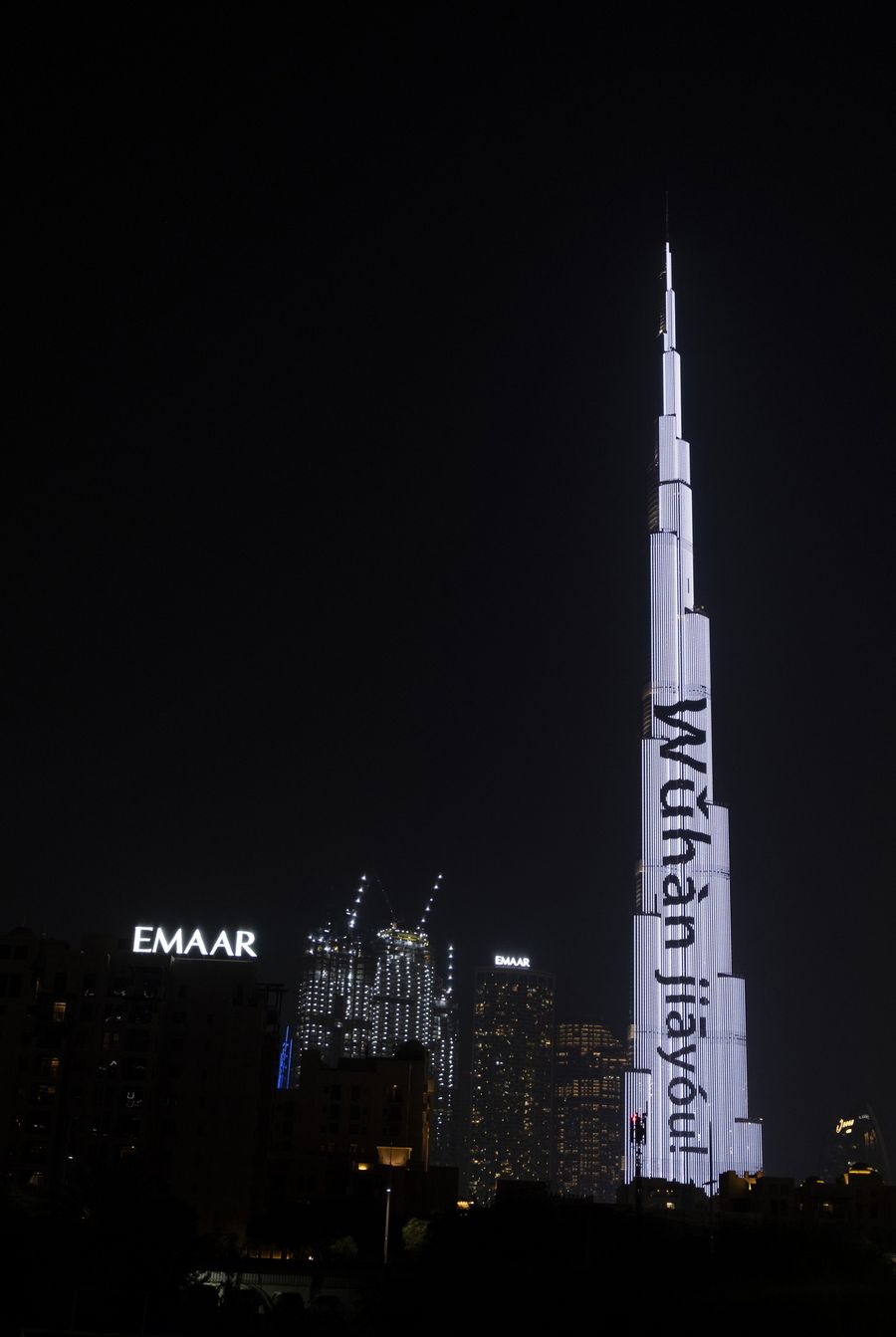 Burj Khalifa is illuminated with slogans in Chinese phonetic alphabets meaning "Wuhan, come on" in Downtown Dubai, the United Arab Emirates (UAE), Feb. 2, 2020, to cheer China up in the fight against the novel coronavirus. (WAM/Handout via Xinhua)