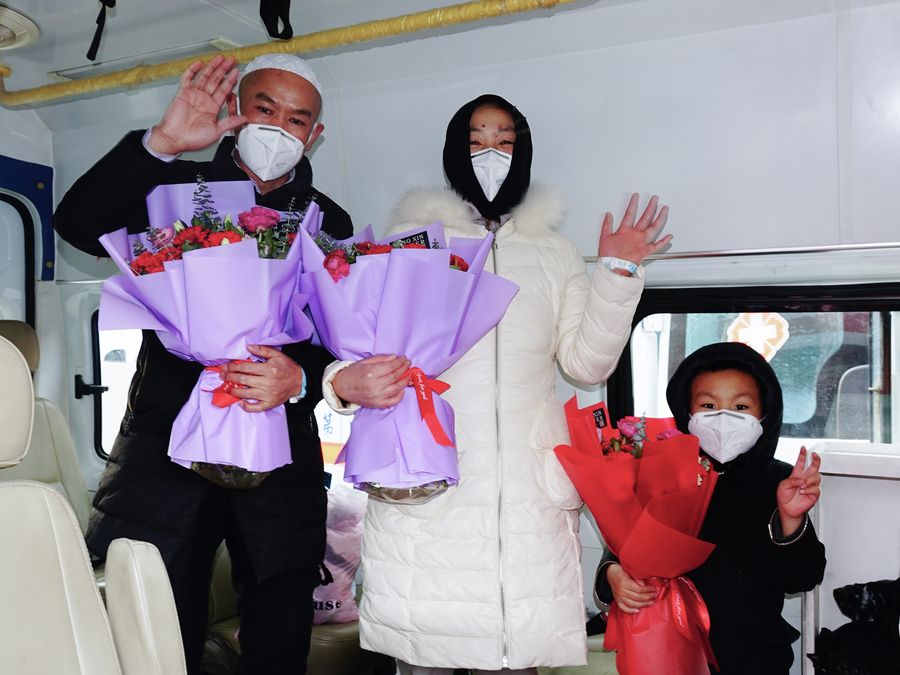 Cured patients wave at the No.4 People's Hospital in Xining, northwest China's Qinghai Province, Feb. 5, 2020. Three pneumonia patients infected with the novel coronavirus were cured and discharged from the hospital on Wednesday. (Photo by Zhang Haidong/Xinhua)