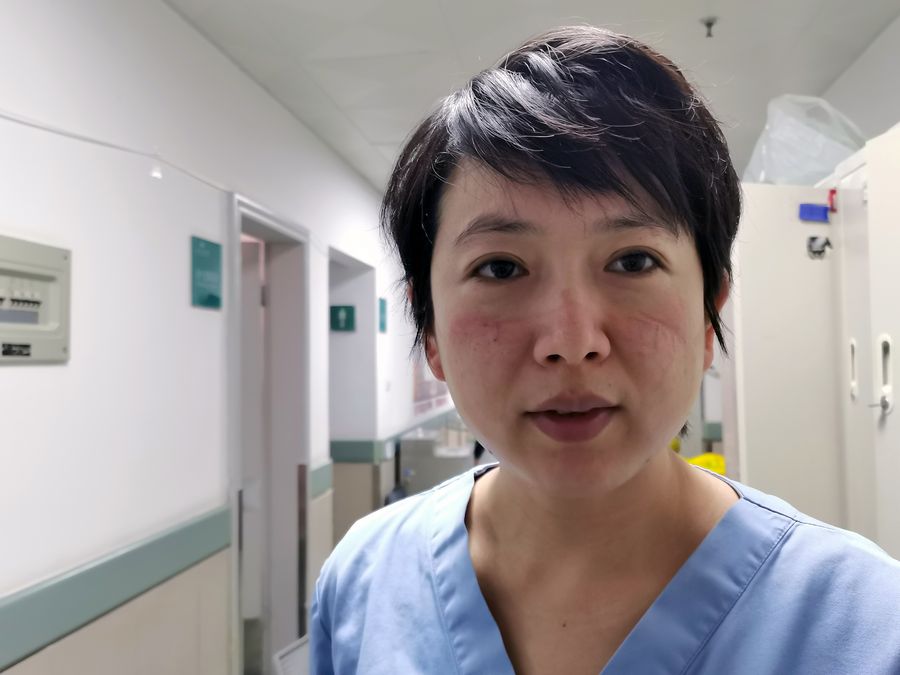 Photo taken with a mobile phone on Feb. 5, 2020 shows marks caused by protective device on the face of a nurse after she walks out of an isolation ward of the intensive care unit at Zhongnan Hospital of Wuhan University in Wuhan, central China's Hubei Province. (Photo by Zhong Nanxuan/Xinhua)
