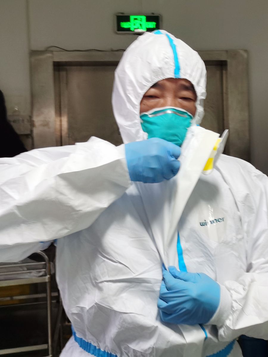 Photo taken with a mobile phone on Feb. 5, 2020 shows Peng Zhiyong, the director of the intensive care unit, putting on protective suit before treating patients at the preparation area of the isolation ward in Zhongnan Hospital of Wuhan University in Wuhan, central China's Hubei Province. (Photo by Zhong Nanxuan/Xinhua)