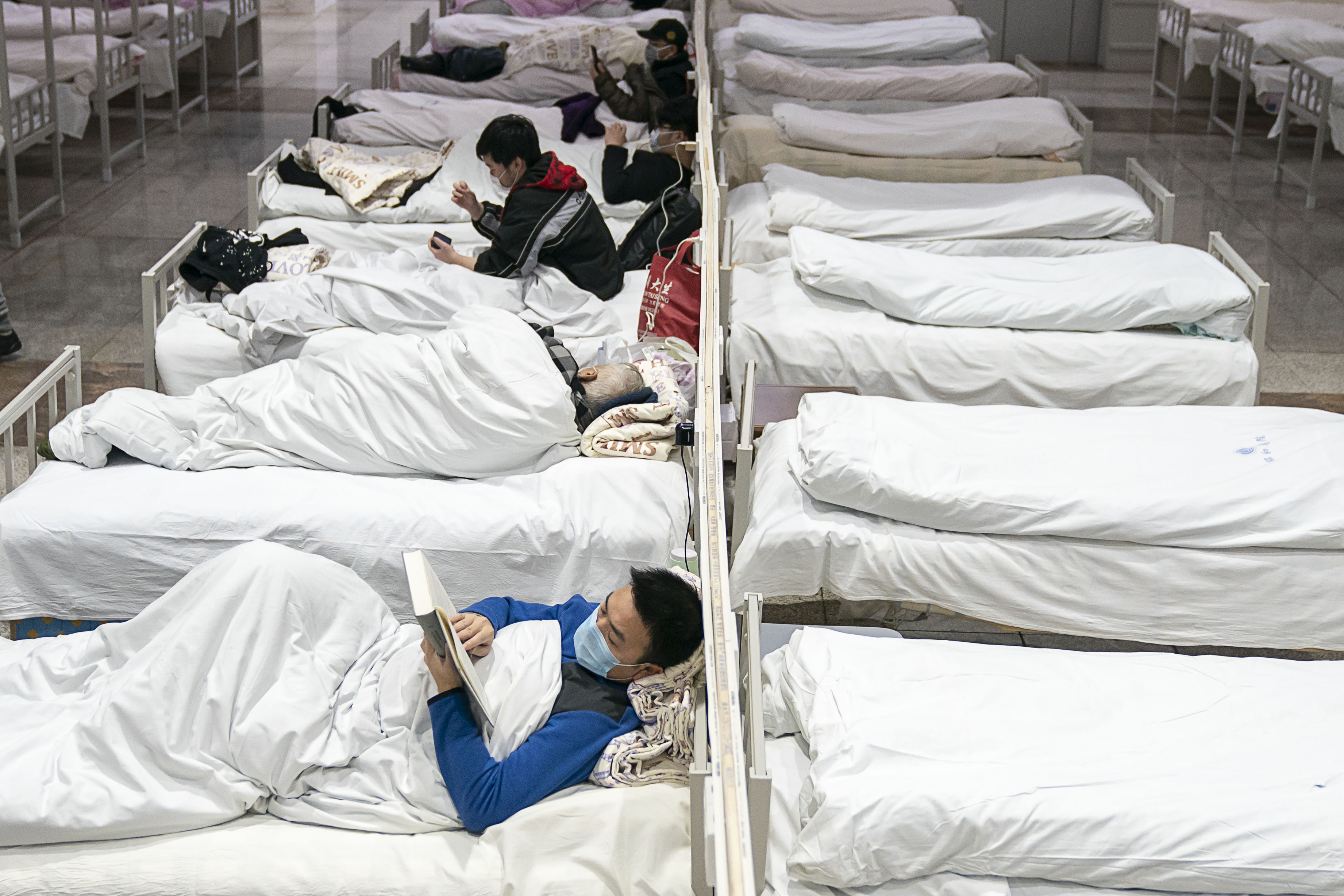 Patients infected with the novel coronavirus stay at a makeshift hospital converted from an exhibition center in Wuhan, central China's Hubei Province, Feb. 5, 2020. (Xinhua/Xiong Qi)