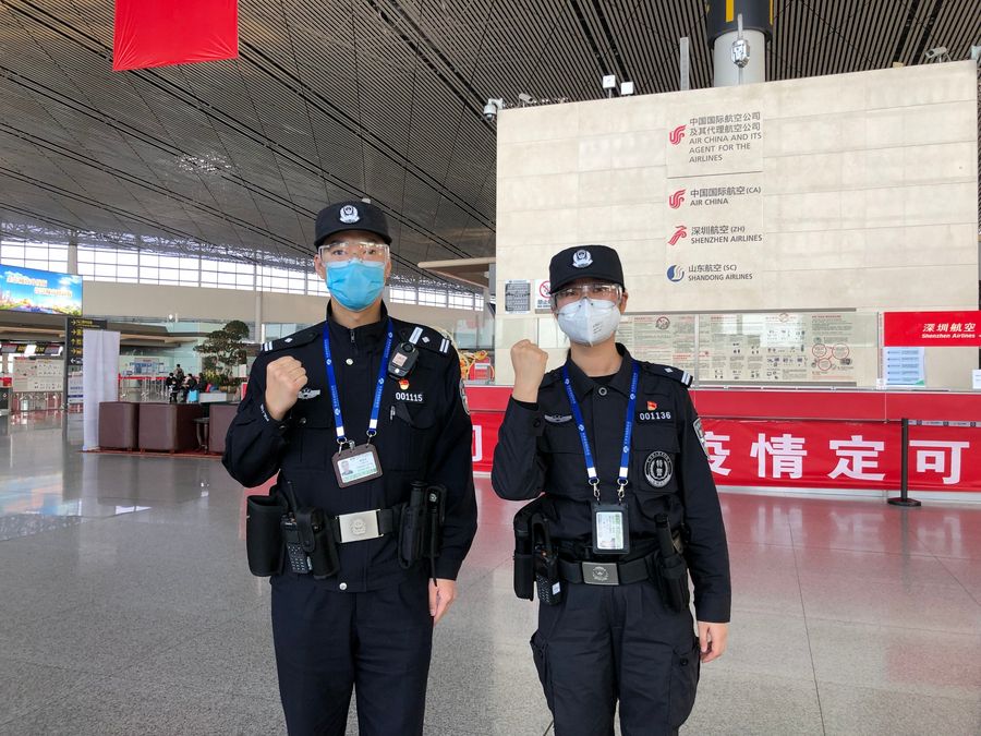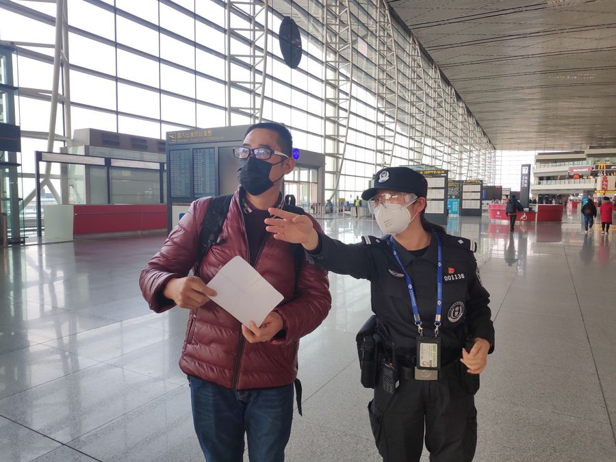 Wang is in charge of the daily patrol in different terminals, dealing with emergencies and assisting medical workers to administer temperature checks of passengers.