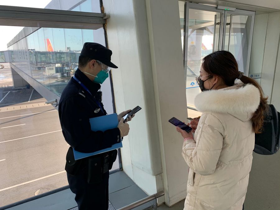 Zhao Hongwei registers a passenger arrived at Binhai International Airport in Tianjin, north China, Feb. 1, 2020. (Provided to Xinhua)