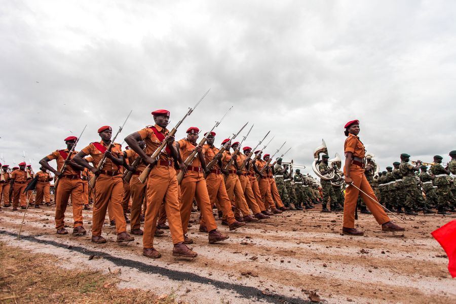 Uganda's Prison officers take part in a parade during the 39th Tarehe Sita Military anniversary in Nakaseke district, central Uganda, Feb. 6, 2020. (Xinhua/Hajarah Nalwadda)