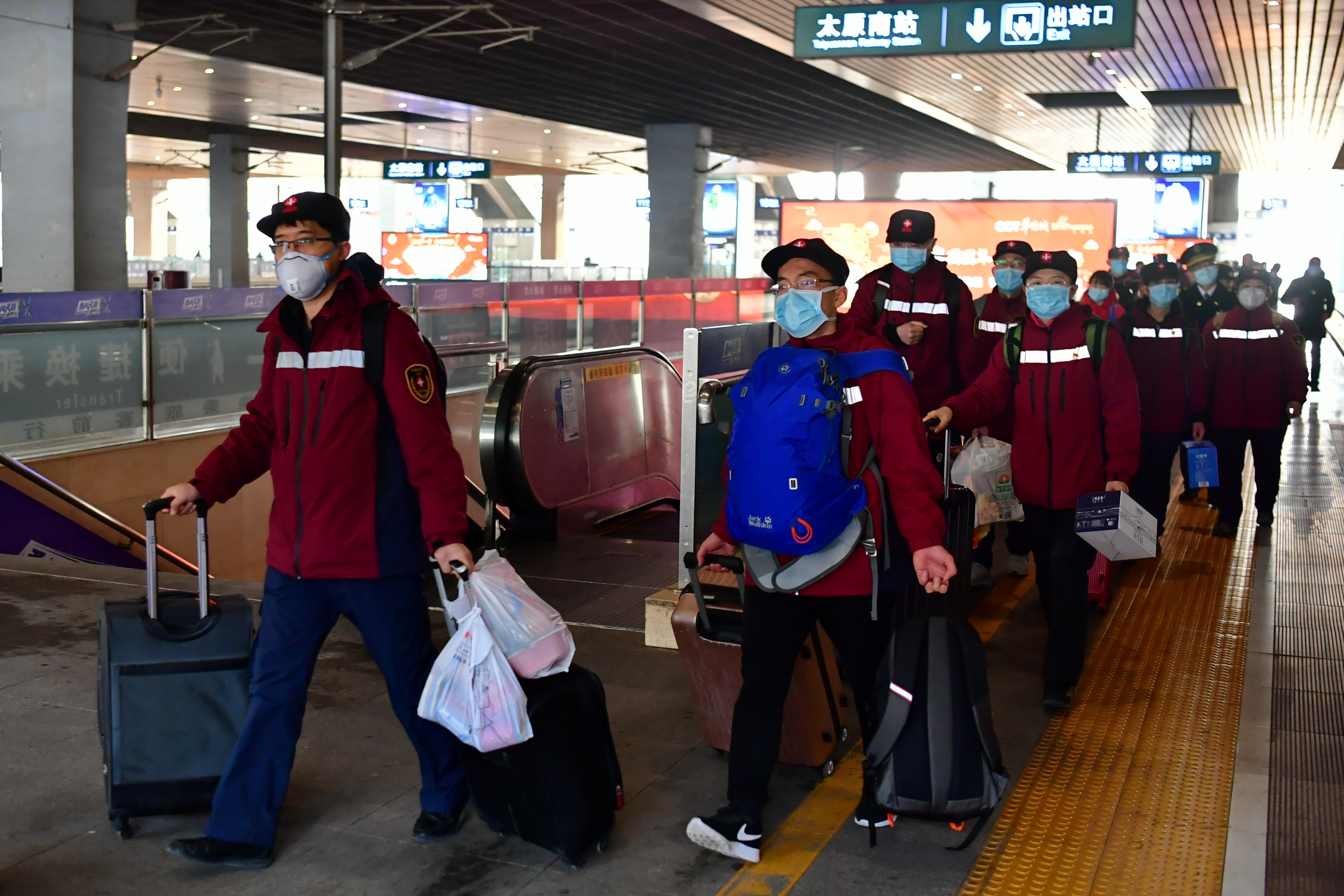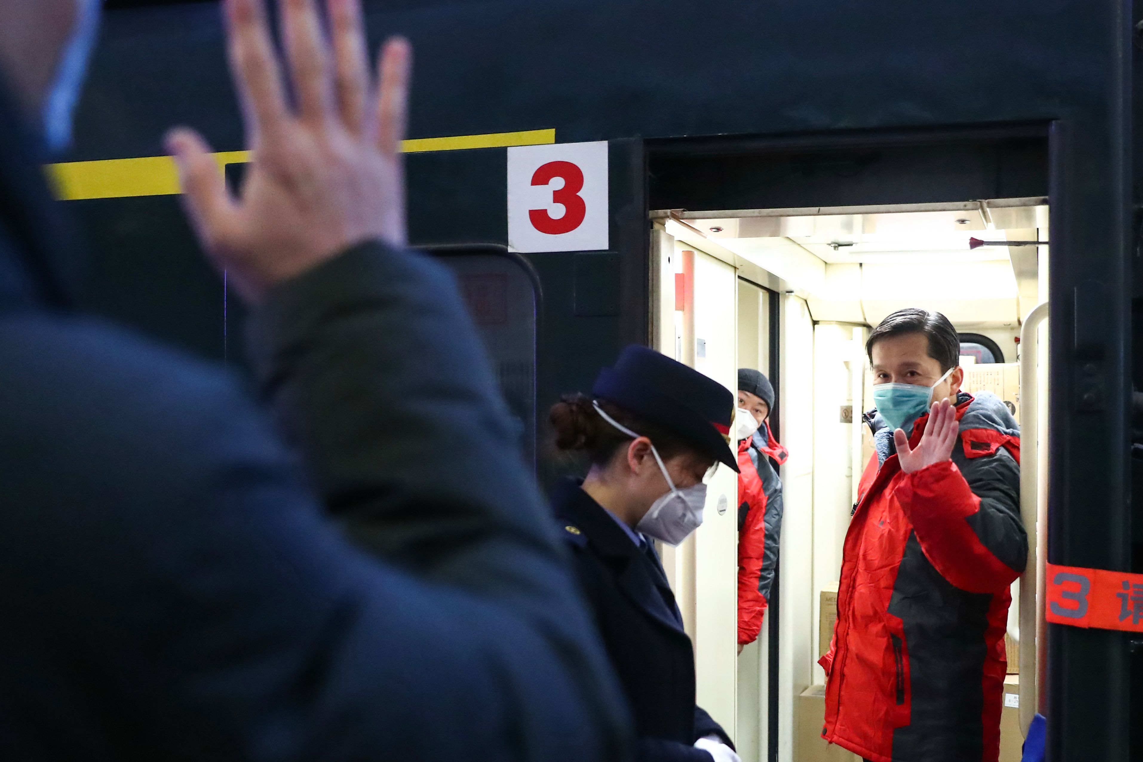 A medical team walk to board a train at Taiyuan South Railway Station in Taiyuan, north China's Shanxi Province, Feb. 5, 2020. (Xinhua/Cao Yang)