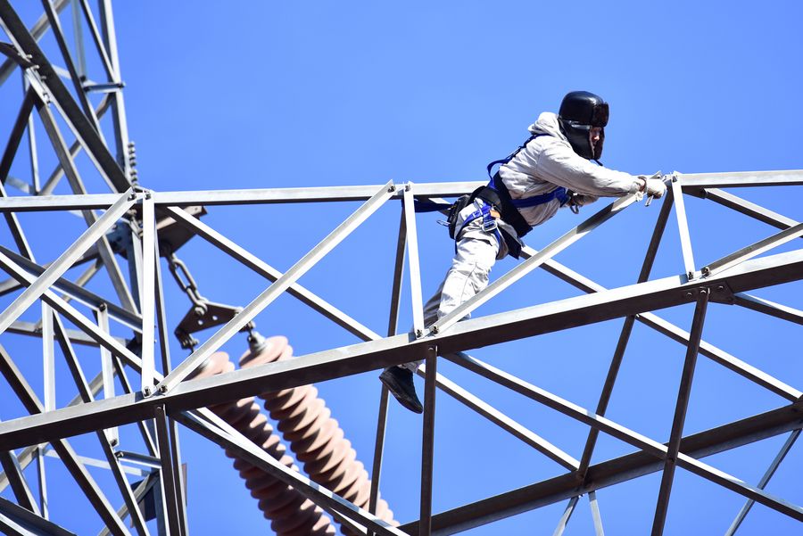 A staff member of Minhe branch of the State Grid Qinghai Electric Power Maintenance Company checks the condition of power grids in the mountainous region of northwest China's Qinghai Province, Jan. 7, 2020. (Xinhua/Wu Gang)