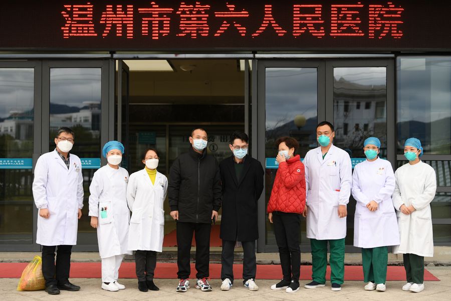 Three cured patients pose for a group photo with medical workers in front of No. 6 People's Hospital of Wenzhou Central Hospital Medical Group in Wenzhou, east China's Zhejiang Province, Feb. 7, 2020. (Xinhua/Weng Xinyang)