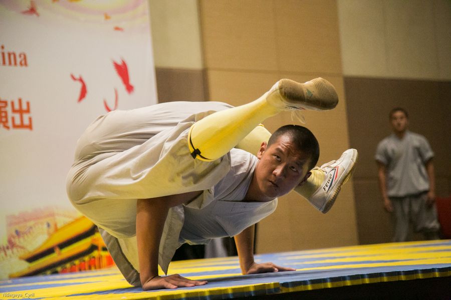 A Chinese Kung Fu (martial arts) performance is staged in Kigali, capital city of Rwanda, on Sept. 16, 2019. Various Chinese Kung Fu (martial arts) performances were staged here Sunday evening to celebrate the 70th anniversary of the founding of the People's Republic of China. Chinese and Rwandan performers, including adults and children, entertained a full house of about 500 spectators with various Kung Fu performances such as Tai Chi, Wing Chun, Qigong and Sanda. (Photo by Cyril Ndegeya/Xinhua)
