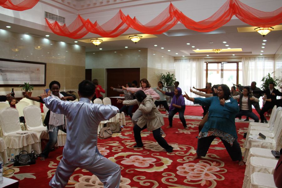Foreign diplomats are seen exercising Baduanjin (traditional Chinese breathing exercise) during a lecture on the traditional Chinese medicine at the Chinese Embassy in Windhoek, capital of Namibia, July 28, 2015. About 30 foreign diplomats on Tuesday attended the lecture. (Xinhua /Wu Changwei)