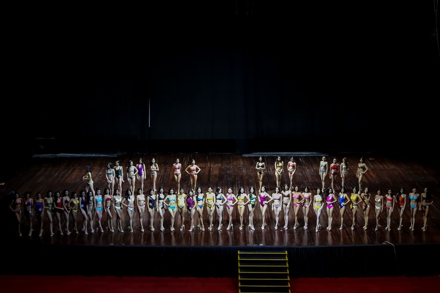 Contestants pose onstage during the final screening of candidates for the Binibining Pilipinas (Miss Philippines) 2020 beauty pageant in Quezon City, the Philippines, Feb. 6, 2020. (Xinhua/Rouelle Umali)