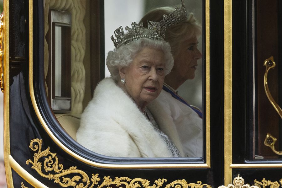 File photo shows British Queen Elizabeth II travels by carriage along The Mall ahead of the State Opening of Parliament ceremony at the Palace of Westminster in London, Britain, Oct. 14, 2019. (Photo by Ray Tang/Xinhua)